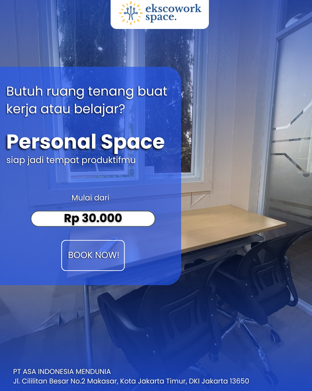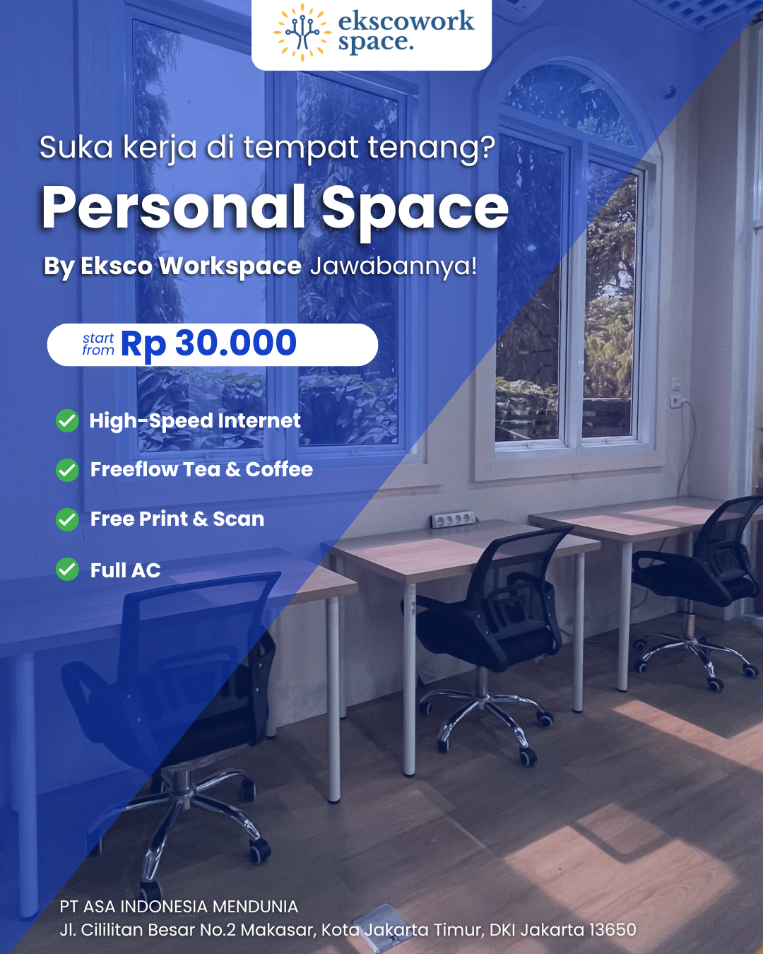 Kalau menyewa kantor biasa, sewanya biasanya agak ketat, ruangannya pun jauh lebih banyak daripada yang dibutuhkan, dan hanya ada satu perusahaan saja.